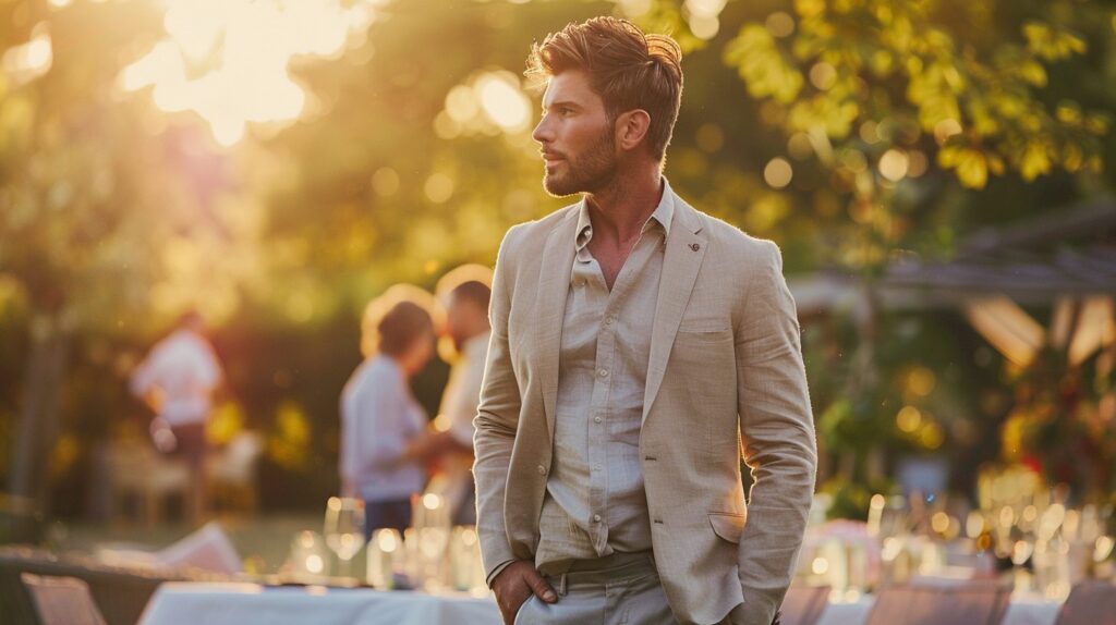 Dress pants or chinos paired with a blazer or sports coat. Linen or button-down shirts keep it relaxed. Avoid sneakers unless the wedding is extremely casual. Light colors like beige, pale blue, or gray work well for daytime weddings.