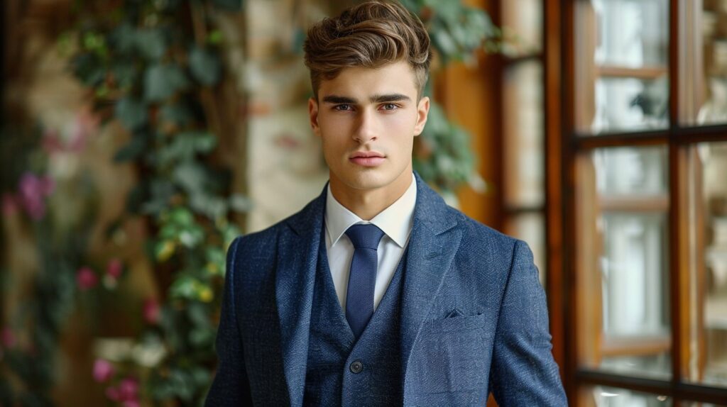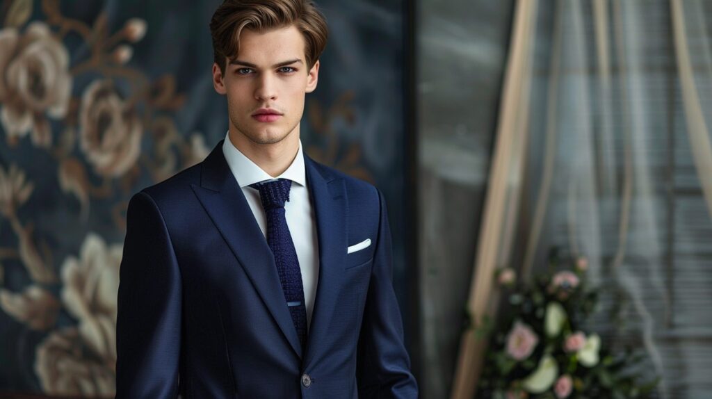 A textured navy blue suit, such as one made from tweed or patterned fabric, adds depth and personality. It’s a great way to stand out subtly while keeping your look sophisticated and refined.