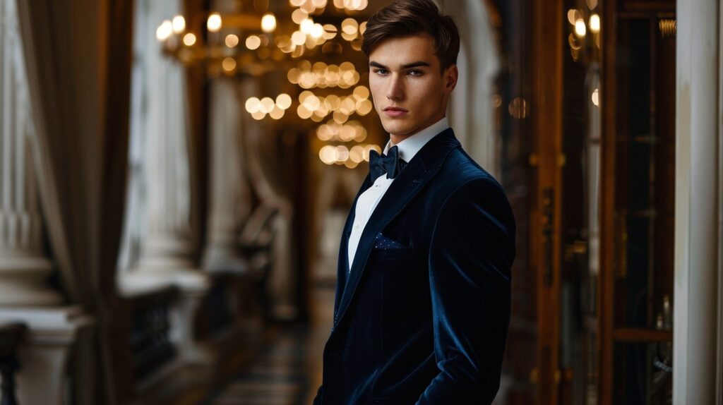 A velvet navy blue suit brings a touch of luxury and old-school charm. It’s perfect for evening proms, offering a soft, rich texture that shines under the lights.