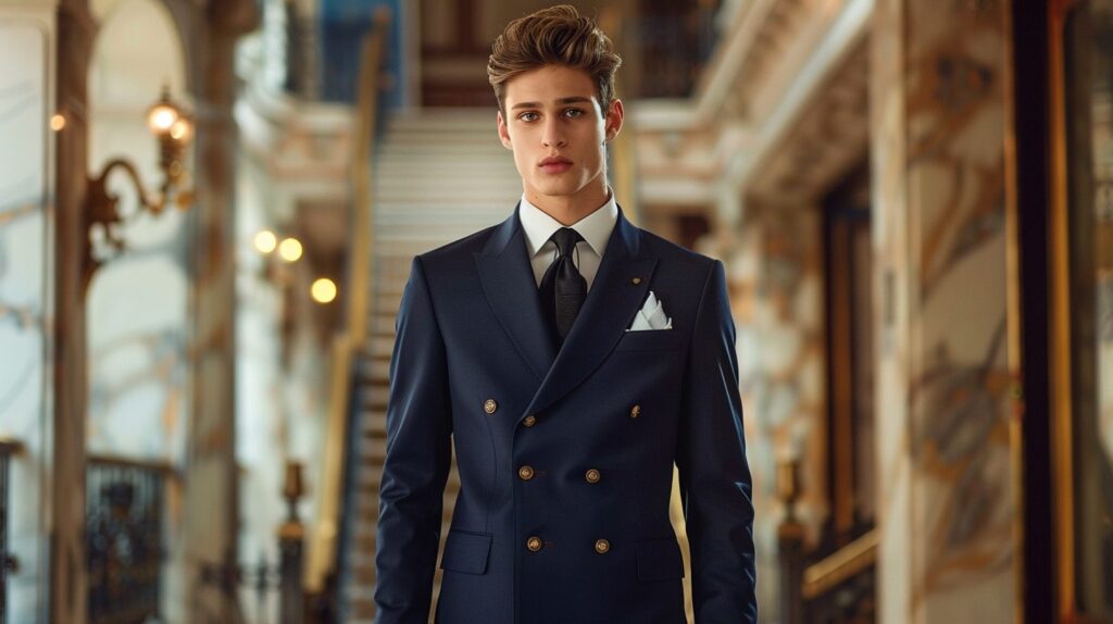 A double-breasted navy blue suit has a strong, confident look. With its overlapping front and extra buttons, it’s a bold option for anyone who wants a powerful, fashion-forward style.