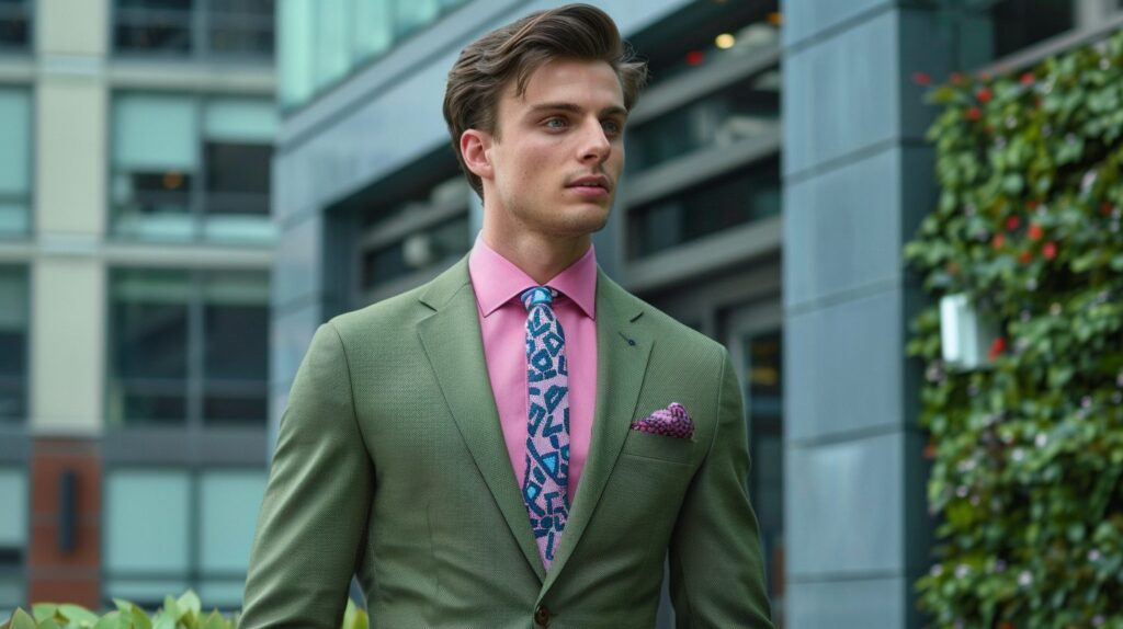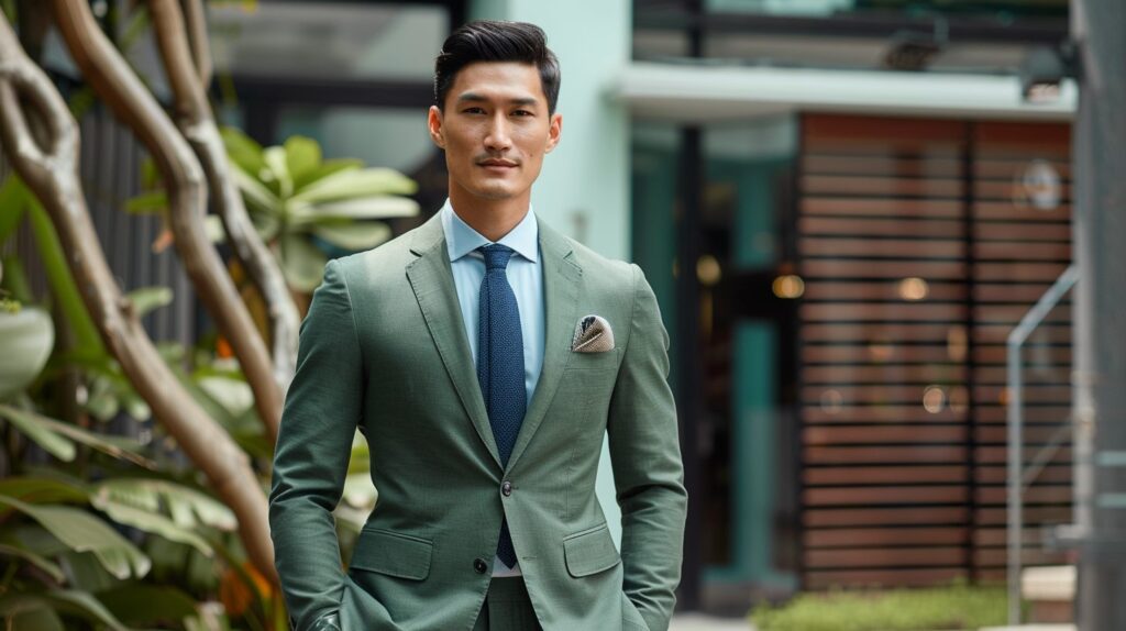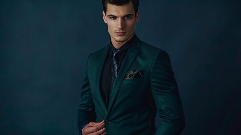 Pair dark green suits with navy ties for evening events, or light green suits with sky-blue ties for daytime occasions. Add a crisp shirt and simple accessories for a clean finish.
