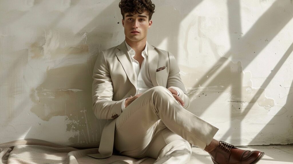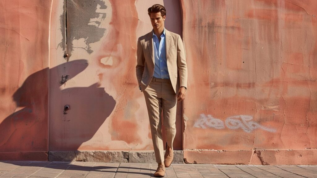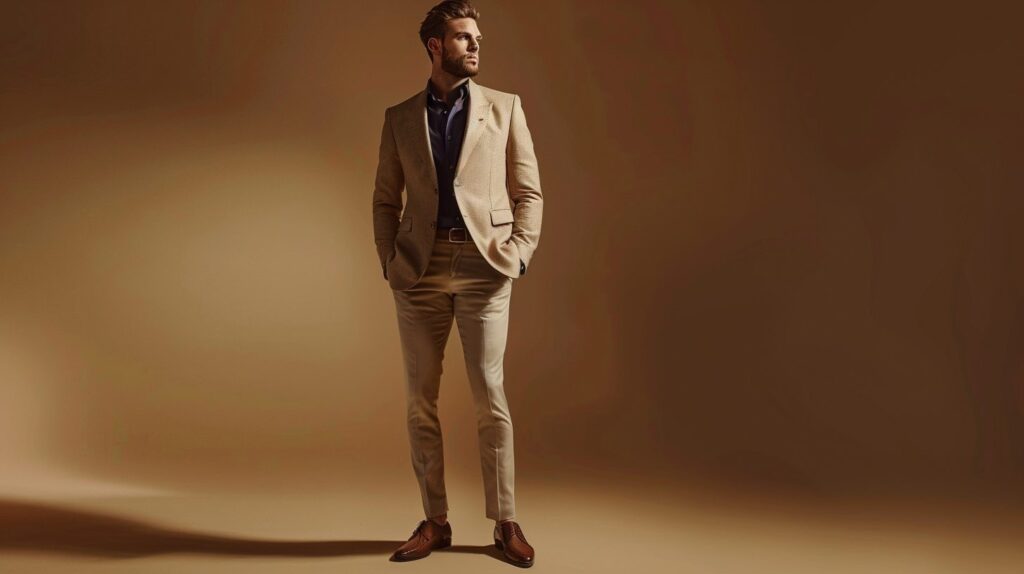 Texture plays a significant role in determining the overall tone of a beige suit. Lightweight fabrics feel relaxed, while wool or textured fabrics feel more formal.