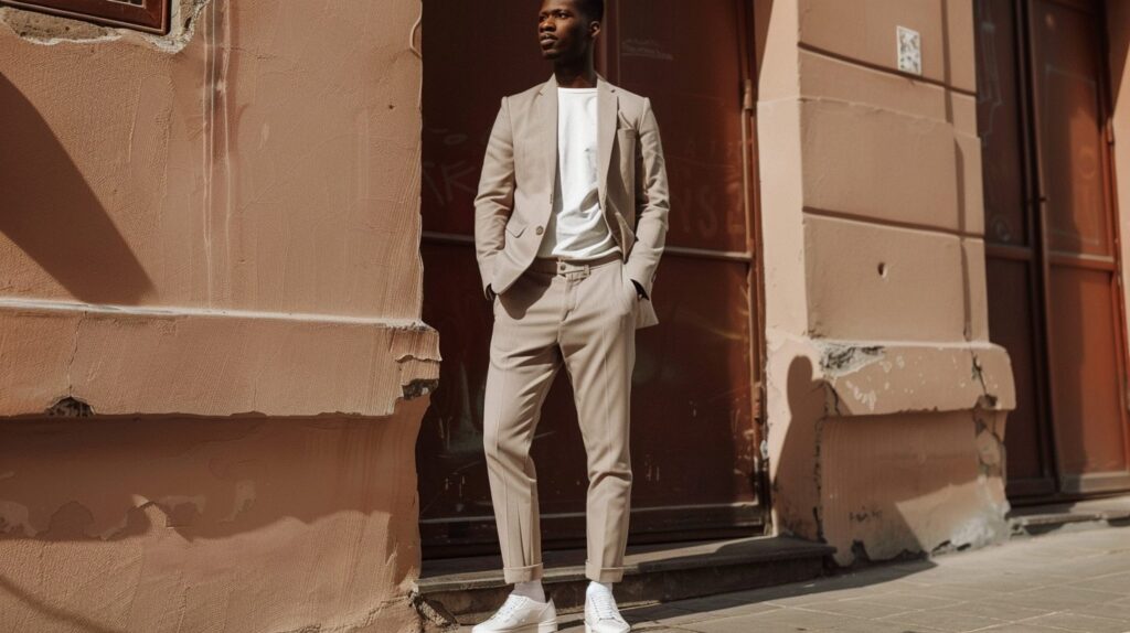 For casual outings, beige suits can be dressed down with sneakers and a simple tee. Keeps the style effortless and modern.